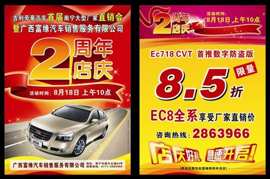 吉利帝豪汽車(chē)首屆南寧大型廠家直銷(xiāo)會(huì)暨廣西富緣汽車(chē)銷(xiāo)售服務(wù)有限公司兩周年店慶,“買(mǎi)就送”,“以生日的名義,釋放8.5折的能量”,前所有的價(jià)格震撼!