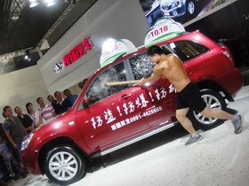 一棒、兩棒、三棒……,當巨大的敲擊聲響起,奇瑞展臺早已被擁擠的人群包圍的水泄不通。只見一位赤膊上身,滿身肌肉的壯漢,此刻正掄圓了手中的胳膊粗的壘球棒,向著面前一輛SUV的車窗再次狠狠砸去。隨著“砰”的一聲巨響,那塊已經遍布裂痕,看似搖搖欲墜的車窗,卻依然奇跡般的紋絲未動。而壯漢手中的那根壘球棒,卻不堪連續(xù)打擊段為兩截。雷鳴般的掌聲瞬間從人群中爆發(fā)而出,瑞虎好車!瑞虎真棒!的贊美聲更是不絕于耳。