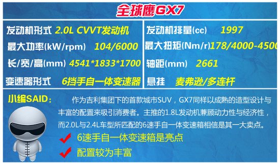 動力方面,的GX7為搭載JL4G18的1.8升CVVT全鋁發(fā)動機的車型,最大功率可以達到138馬力,與之搭配的是5擋手動變速箱。