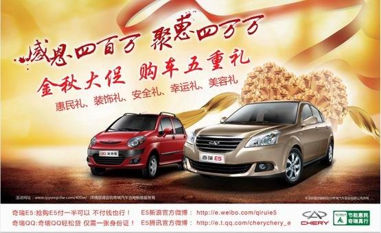 奇瑞汽車(chē)十年磨礪,創(chuàng)贏四百萬(wàn)用戶(hù)信賴(lài)!這是一種成就,更是一項(xiàng)榮耀。為了答謝廣大用戶(hù),奇瑞汽車(chē)以 “金秋大促 購(gòu)車(chē)五重禮”的大力優(yōu)惠幅度禮讓廣大消費(fèi)者。活動(dòng)期間,購(gòu)買(mǎi)奇瑞E5、奇瑞QQ、旗云1、旗云2、旗云3的用戶(hù),即可暢享奇瑞汽車(chē)“五重”金秋好禮:惠民禮、裝飾禮、安全禮、幸運(yùn)禮、美容禮。五重大禮,紛享驚喜。這個(gè)9月,和奇瑞汽車(chē)一起暢享金秋購(gòu)車(chē)盛宴。