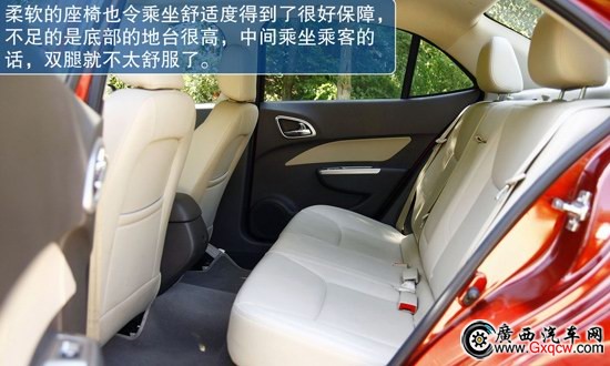 后排的乘坐空間很寬裕,兩拳的腿部空間余量,以及頭部空間接近一拳的余量,令乘客可以比較放松地乘坐其內(nèi),柔軟的座椅也令乘坐舒適度得到了很好保障。不足的是底部的地臺很高,中間乘坐乘客的話,雙腿就不太舒服了。