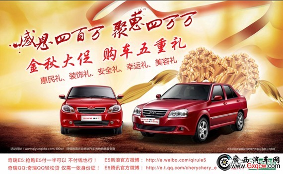 活動期間,購買旗云1、旗云2、旗云3的用戶,即可暢享奇瑞汽車五重金秋豪禮:惠民禮、裝飾禮、安全禮、幸運禮、美容禮五重大禮。