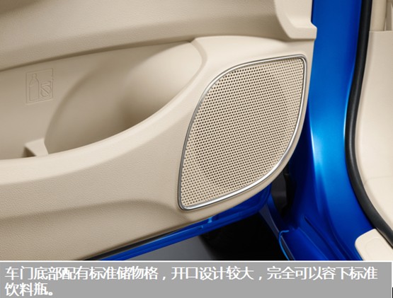從儲物功能來看,速銳可以算是一款注重實用性的車型,有多達18處的儲物設計,充分滿足駕乘人員“隨手放”的可能。首先是前車門,速銳前車門開啟角度較大,方便乘客上下車,前車門底部配有標準儲物格,開口設計較大,可以容下標準飲料瓶。
