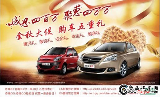 奇瑞E5自上市以來,憑借高性價比和良好的口碑,獲得市場的認(rèn)可。近期更是借助入選國家節(jié)能惠民工程,全國開展“金秋大促購車五重禮”促銷活動,再次引爆終端銷售。9月份在汽車行業(yè)逐漸復(fù)蘇之際,奇瑞E5以“運(yùn)動版”這款新車作為開篇,期待會給下半年奇瑞的銷售帶來強(qiáng)有力的推進(jìn)。