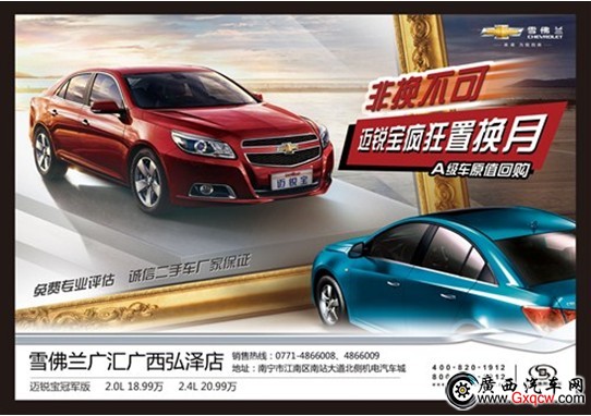 弘澤雪佛蘭本周末(9月15、16日)開展邁銳寶瘋狂置換活動。只要您的車車況良好,且三年無事故,不限品牌,均有機會享受最高原價回購,相當于免費開了三年車,老車立即升級為時下熱賣的美系B級車——“雪佛蘭全球中高級旗艦車型”邁銳寶,再享最高3萬元鉅惠。(廣西弘澤雪佛蘭擁有活動解釋權。)