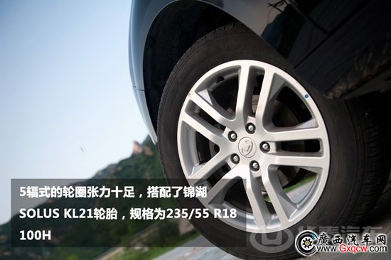 尾部的設(shè)計(jì)富有層次,后部底盤下護(hù)板和倒車?yán)走_(dá)是全系標(biāo)配,這種做法在自主品牌中值得提倡。5輻式的輪圈張力十足,搭配了錦湖SOLUS KL21輪胎,規(guī)格為235/55 R18 100H,足夠的寬度也為寶利格的行駛提供了有力的支持。