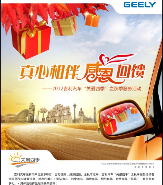 金秋送爽,丹桂飄香,2012年9月28日-11月28日,吉利汽車“關(guān)愛四季”之秋季服務(wù)活動在全國范圍內(nèi)盛大啟動,專業(yè)安全免費檢測,多重尊崇禮遇,感恩多年,相伴讓您逸享金秋,輕松出游。具體活動內(nèi)容如下: