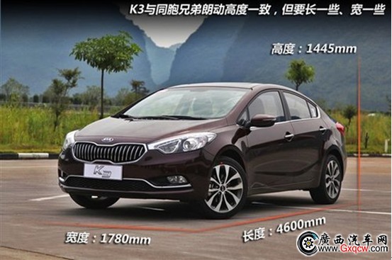 K3在外型上也有著典型的起亞風格,車身長寬高分別為:4600mm、1780mm、1445mm,長、寬都略大于朗動,高度保持一致。而2700mm的軸距則在同級別車型中占有很大的優(yōu)勢,相信K3的內部乘坐空間會給我們不錯的體驗。