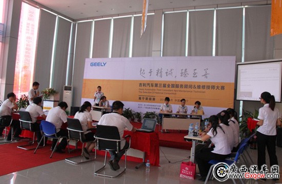 2012年9月27日,吉利汽車第三屆服務(wù)顧問與維修技師大賽南寧中心晉級賽在廣西泓埠汽車銷售服務(wù)有限公司圓滿落幕。此次大賽的目的是更好的打造“關(guān)愛在細微處”的服務(wù)理念,整體提高服務(wù)中心各服務(wù)網(wǎng)點服務(wù)顧問的整體業(yè)務(wù)技能、綜合素質(zhì),全方位提升吉利汽車用戶滿意度和服務(wù)水平,為打造品質(zhì)服務(wù)、共建品質(zhì)吉利夯實基礎(chǔ)。