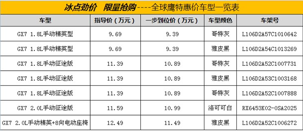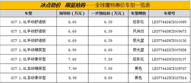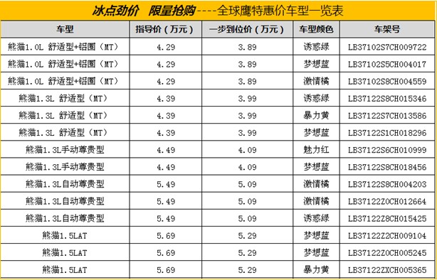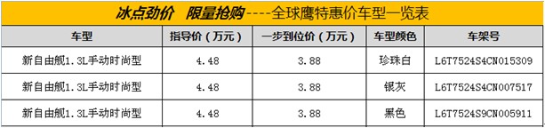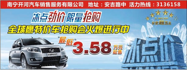 為回饋廣大消費(fèi)者一直以來對全球鷹品牌的關(guān)注與支持,本周(10月28日),開河全球鷹4S店將舉行一場“冰點(diǎn)勁價 限量搶購—全球鷹特價車搶購會”活動,活動當(dāng)天,指定的特價車優(yōu)惠幅度最大,最低僅售3.58萬元起,指定車架號,特惠的價格。當(dāng)日購賣指定車型客戶還可贈送廠家額外贈送的1111元油卡!活動僅限一天!