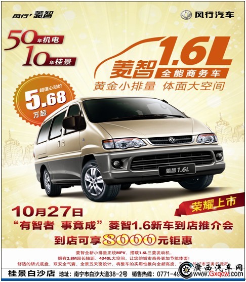 桂景白沙店菱智1.6全系登場了,最低5.68萬元起,10月27日下午2點(diǎn)半廣西桂景將隆重舉行“有智者 事竟成”菱智1.6L新車到店推介會(huì),最高優(yōu)惠8000元,到店購車還可享受多重好禮,廣西桂景全體員工恭候您的光臨。詳詢:0771-4916511/4923208 地址:南寧市白沙大道38-2號(hào)(南國花園商城對面)【50年機(jī)電 10年桂景】