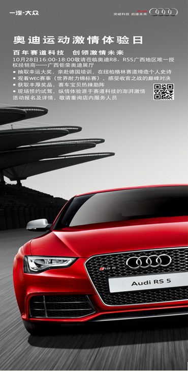 結(jié)合奧迪銷售事業(yè)部舉行的奧迪R8、RS5高性能運(yùn)動(dòng)車戰(zhàn)略發(fā)布以及WEC賽事轉(zhuǎn)播活動(dòng),10月28日將在經(jīng)銷商終端開展奧迪運(yùn)動(dòng)激情體驗(yàn)日主題活動(dòng)。鉅榮奧迪很榮幸成為廣西地區(qū)舉辦此次活動(dòng)的唯一授權(quán)經(jīng)銷商。