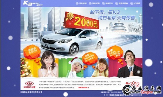 12月24日8時至12月25日8時,如果北京降雪量大于等于3毫米,DYK將對全國所有11月24日至12月20日期間購買K3車型的前1萬名幸運車主,贈送2000元現(xiàn)金大禮。