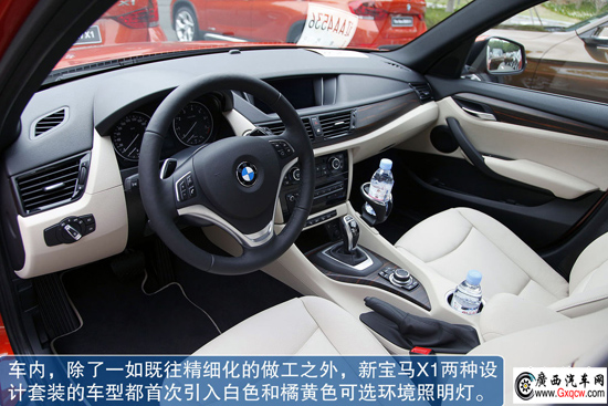 車內,除了一如既往精細化的做工之外,新寶馬X1兩種設計套裝的車型都首次引入白色和橘黃色可選環(huán)境照明燈,高檔次的產(chǎn)品定位也依然得到清晰體現(xiàn)。
