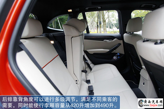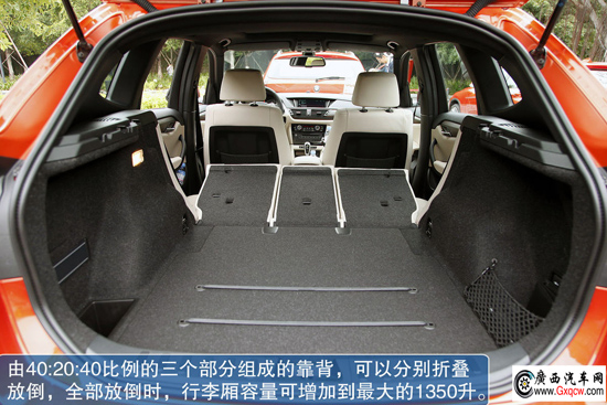 雖然X1的體積很小巧,不過在內部空間功能性上一點也不含糊。與很多正規(guī)SUV一樣,它的空間使用靈活多變。后排靠背角度可以進行多級調節(jié),滿足不同乘客的需要,同時能使行李廂容量從420升增加到490升。此外,由40:20:40比例的三個部分組成的靠背,可以分別折疊放倒,以適應不同成員數(shù)量、不同尺寸行李物品的實際需要,后排靠背全部放倒時,行李廂容量可增加到最大的1350升。