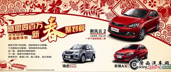 年終歲末,圣誕、新年、春節(jié)一個個溫馨浪漫、其樂融融的節(jié)日接踵而至。為慶祝奇瑞汽車全球銷量突破400萬輛,自2012年12月1日起,奇瑞汽車為感恩回饋廣大顧客,特推出“感恩四百萬 新春聚劃算”大型促銷活動。屆時,奇瑞A3也同步推出新春購車三連送活動,突破萬元的惠民禮、導航禮、裝飾禮件件貼心,連環(huán)相送。