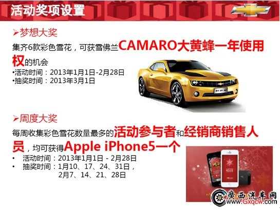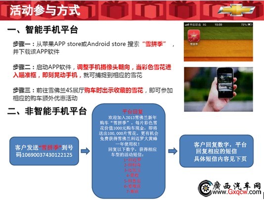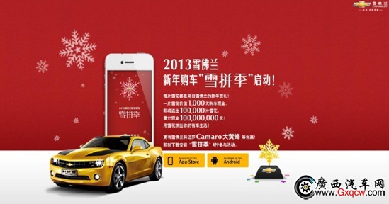什么是“雪拼季”?“雪佛蘭新年購(gòu)車(chē)雪拼季”是雪佛蘭品牌在2013年推出的新年購(gòu)車(chē)優(yōu)惠活動(dòng),它以智能手機(jī)終端APP游戲“雪拼季”為載體,通過(guò)玩游戲應(yīng)用來(lái)贏得購(gòu)車(chē)優(yōu)惠和參與大獎(jiǎng);顒(dòng)形式新穎,獎(jiǎng)品豐富,并融合了時(shí)下年輕人的諸多生活熱點(diǎn):APP、iPhone5、年底shopping(血拼)和Dream Car,開(kāi)創(chuàng)了汽車(chē)行業(yè)娛樂(lè)化促銷(xiāo)之先河。