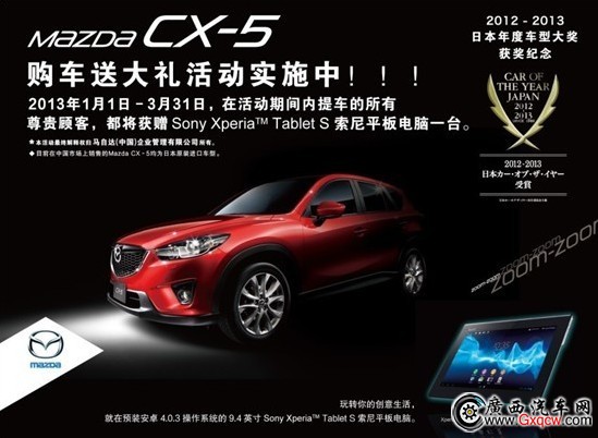 活動期間購CX-5任意車型即可獲贈索尼Xperia Tablet S平板電腦一臺!