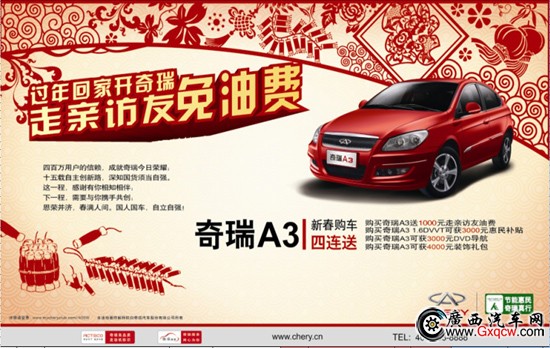 年終歲末,值此新春佳節(jié)之季,奇瑞A3購車優(yōu)惠更“給力”,“過年回家開奇瑞.走親訪友免油費(fèi)—購奇瑞A3四重豪禮相贈”優(yōu)惠購車活動火暴進(jìn)行中。