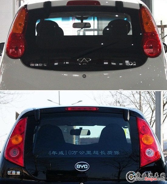 比亞迪F0與新QQ的尾巴很像,如果沒有任何標(biāo)識(shí),還真看不出誰是誰。新QQ的尾部裝備了兩個(gè)倒車?yán)走_(dá),比較厚道,增加了泊車時(shí)的便利性。比亞迪F0沒有裝備倒車?yán)走_(dá),這點(diǎn)做的不如新QQ。