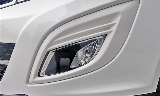 前臉部分,大燈設(shè)計(jì)十分兇悍,下保險(xiǎn)杠和霧燈看上去充滿精神,霧燈造型設(shè)計(jì)很顯眼,柳葉狀看起來(lái)很有創(chuàng)意。采用LED日間行車燈和氙氣大燈顯得都很厚道,值得表?yè)P(yáng)。