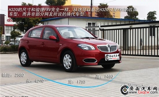 中華H320的長、寬、高、軸距分別為4210/1755/1460/2580(mm),尺寸和駿捷FRV完全一樣,從這可以看出H320只是FRV的改款車型,而并非部分網(wǎng)友所說的換代車型。