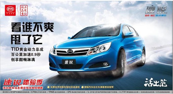 應(yīng)廣大車友的強(qiáng)烈要求,南寧高新區(qū)康和富利比亞迪4S期間店,3月15日-3月31日,每周六周日將舉行“TID黃金動(dòng)力組合,“動(dòng)”感不同”的比亞迪速銳體驗(yàn)季活動(dòng)。屆時(shí)您將領(lǐng)略搭載TID黃金動(dòng)力組合的比亞迪速銳超凡的動(dòng)力性能。體驗(yàn)比亞迪速銳在不同路況的非凡表現(xiàn)。享受比亞迪速銳的超炫駕馭樂趣。真正感受“看誰不爽,甩了它”的鋒芒感覺。同時(shí)為了回饋廣大車友對(duì)南寧高新區(qū)康和富利比亞迪4S旗艦店的厚愛,每位到店參加的朋友都將贈(zèng)送精美體驗(yàn)禮;顒(dòng)期間購(gòu)車的朋友將享受VIP的購(gòu)車待遇。