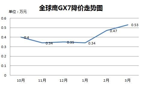 走勢分析:半年內(nèi),全球鷹GX7的價格高點出現(xiàn)在去年11月,而低點出現(xiàn)在今年3月,與哈弗H6、比亞迪S6等車型不同,全球鷹GX7的價格走勢與整體車市走勢并不一致。進入2013年以來,GX7的價格逐漸走低,可以看出合資品牌SUV價格越來越低也對其產(chǎn)生了一定的壓力。預(yù)計,近期GX7的降幅仍然會小幅上漲。