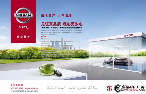 2013年3月22日至4月22日,廣緣科園日產(chǎn)“春暖關(guān)懷 品質(zhì)見證”春季品質(zhì)服務(wù)月為您盛情開啟。我們誠邀您親臨作業(yè)車間,一起參與愛車質(zhì)檢,共同見證至臻品質(zhì)。給您愛車在雨季最大的關(guān)懷,讓您用車更加安心,精彩用車生活由此開啟!