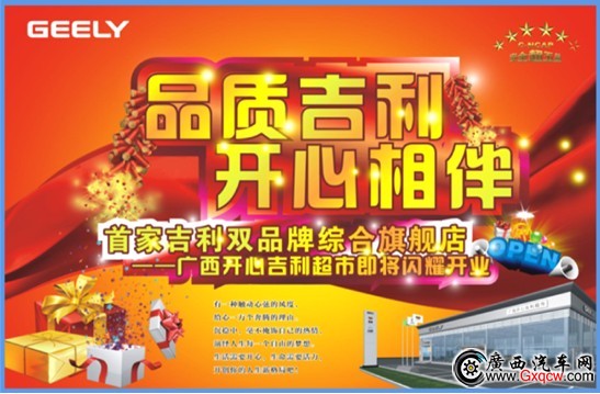 廣西開心吉利超市是吉利汽車官方授權(quán)的首家量販?zhǔn)狡?S店,經(jīng)營吉利帝豪、吉利全球鷹兩個(gè)品牌底下的所有車型。將于4月份正式投入運(yùn)營。新型展廳座落于南寧市江南區(qū)白沙大道普羅旺斯小區(qū)旁。