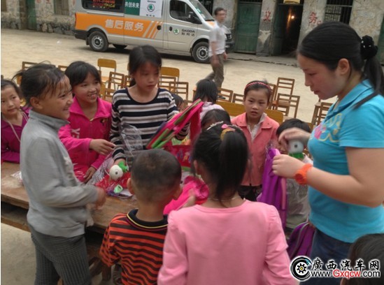 一路經(jīng)過5個小時奔波到達巴馬縣城,再驅(qū)車走曲折盤旋的山區(qū)小路一個半小時,步行20多分鐘,于16時抵達,一個四面處于環(huán)山低谷山區(qū)的本次捐贈助學(xué)的小學(xué)—弄京小學(xué)。車主們不辭辛勞,大人小孩一起上到物資貨運車,把愛心助學(xué)物品搬下車,捐贈給學(xué)校校長,并給小朋友一一發(fā)放書包和紅領(lǐng)巾,召號鼓勵孩子們好好學(xué)習(xí)。其中10號車的敬女士,除了為孩子們帶去學(xué)習(xí)用具等物品外,還想得特別周到,給小朋友帶去卡通小公仔,小女孩用的漂亮發(fā)夾、發(fā)圈,并一一幫小女孩戴上發(fā)圈。敬女士說,她身為兩個孩子的母親,深知山里留守兒童除了缺少學(xué)習(xí)用品,還缺少父母親的關(guān)愛。她希望通過她的點滴細微行為,能給小朋友帶來心靈上的關(guān)愛和溫暖。