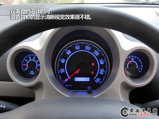 方向盤(pán)的樣式較為簡(jiǎn)潔,遺憾的是沒(méi)有配備多功能操控鍵,不過(guò)方向盤(pán)還是提供了上下調(diào)節(jié)功能。儀表盤(pán)的設(shè)計(jì)時(shí)尚,藍(lán)色背燈的顯示清晰視覺(jué)效果很不錯(cuò)。