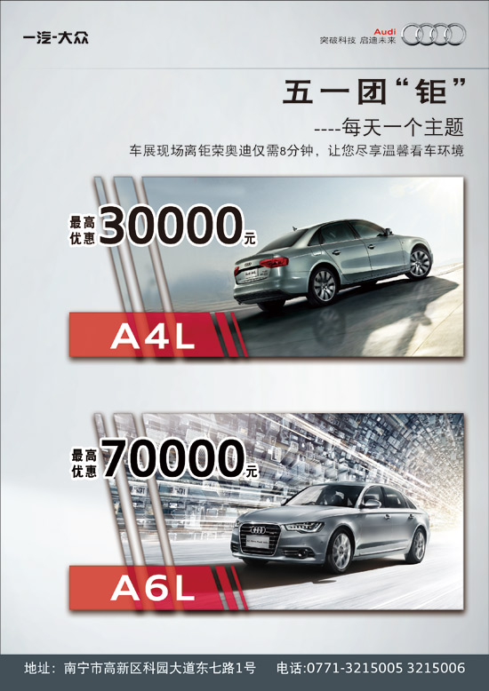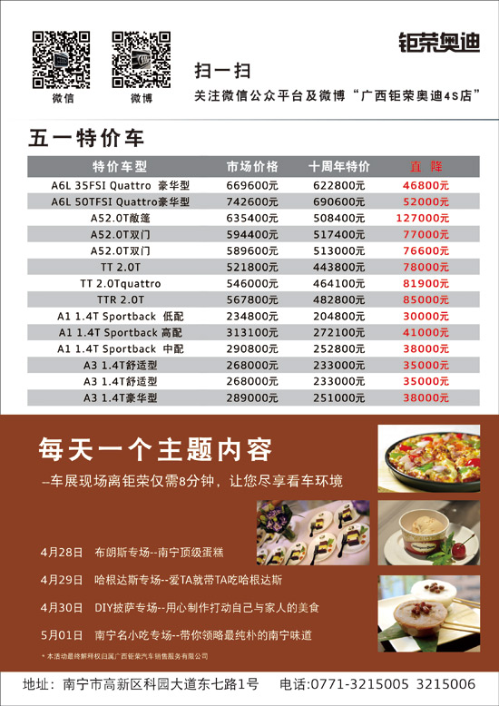 4月28日至5月1日,廣西鉅榮奧迪掀起A4L、A6L超值鉅惠狂潮,更有多款特價(jià)車型等待著您!同時(shí),在鉅榮奧迪展廳內(nèi)將開(kāi)展系列主題活動(dòng),讓您避開(kāi)擁擠人潮,盡享溫馨賞車、購(gòu)車環(huán)境。
