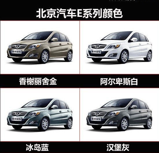 北京汽車E系列共有6種車身顏色,分別為阿爾卑斯白、冰島藍(lán)、漢堡灰、馬德里紅、米蘭銀和香榭麗舍金,除了沒有黑色外,基本覆蓋了市面上的主流顏色。