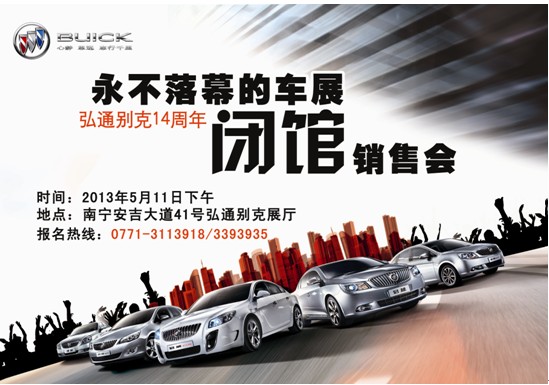 5月11日下午14:00弘通別克4S店特推出“永不落幕的車(chē)展—閉館銷(xiāo)售會(huì)”,將延續(xù)安吉車(chē)展優(yōu)惠政策,購(gòu)車(chē)千元豪華大禮相送。2013全新別克君越3.0L旗艦版已到店,歡迎廣大車(chē)友預(yù)訂購(gòu)車(chē)!弘通別克讓您即刻擁有心中座駕, 別人尚在夢(mèng)想,您已自如駕馭夢(mèng)想……