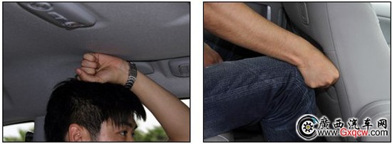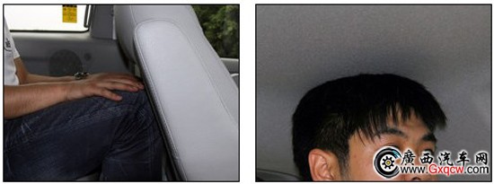 我們再以第二排的腿部空間一拳為例來測試第三排空間,身高180cm的乘客則感到并不那么舒適了,頭部是緊貼車頂?shù)模炔恳彩蔷o貼第二排座椅的靠背,基本沒有富裕出更多的空間。值得欣慰也就是座椅的柔軟度還不錯,且第三排具有空調(diào)出風(fēng)口。