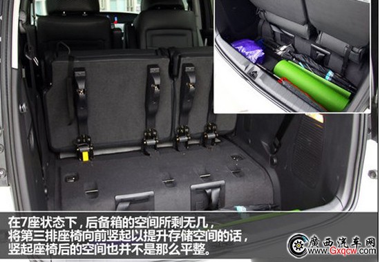在7座狀態(tài)下,后備箱的空間所剩無幾,基本上只有能存放兩個登機箱的空間。而將第三排座椅向前豎起以提升存儲空間的話,豎起座椅后的空間也并不是那么平整。儲物能力雖然提升,但是看起來并不那么規(guī)整。