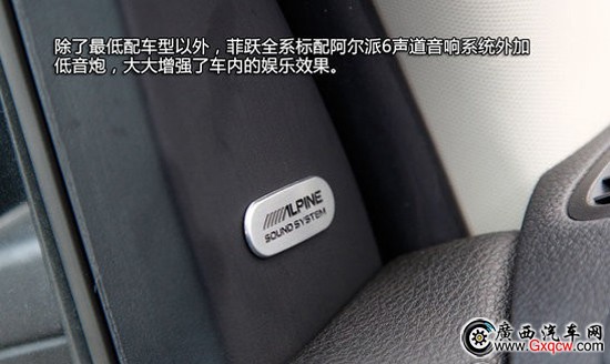 2.4L高配車型以及3.6L智能全驅(qū)版的中控臺搭載了一塊8.4英寸的超大液晶觸摸屏,除了帶有GPS導(dǎo)航、倒車影像等功能之外,一些常用的車輛功能也通過這里來進(jìn)行控制,比如空調(diào)、藍(lán)牙、座椅加熱等。除了最低配的車型之外,菲躍全系標(biāo)配阿爾派6聲道音響系統(tǒng)外加低音炮,大大增強(qiáng)了車內(nèi)的娛樂效果。
