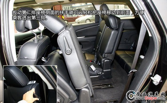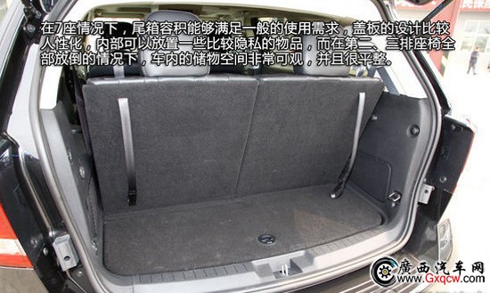 扳動第二排座椅側(cè)面的扶手就可以輕松的把座椅移動到前面,方便乘客進出第三排。在7座的情況下,尾箱內(nèi)可以滿足一般的使用需求,蓋板的設(shè)計比較人性化,內(nèi)部可以放置一些比較隱私的物品,而在第二、三排座椅全部放倒之后的情況下,車內(nèi)的儲物空間非?捎^,并且地板非常平整。