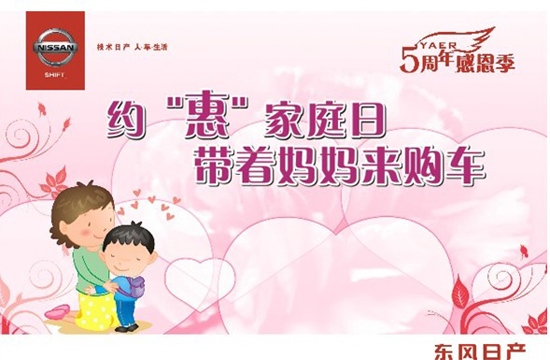 東風日產(chǎn)廣緣科園店5歲啦!5月,5周年盛典感恩季溫情開啟。敬請期待!5月11日,約“惠”家庭日,在母親節(jié)到來之際,帶著媽媽一起到東風日產(chǎn)廣緣科園店感受購車的樂趣與專業(yè)的服務;顒赢斕斓降曩徿嚰纯蓞⑴c抽獎,車載冰箱、精美陶瓷、真皮錢包、代金券、體驗券!百分百中獎!帶著媽媽一起到廣緣科園店,讓媽媽享受舒適按摩旅程!凡蒞臨東風日產(chǎn)廣緣科園店的母親,均可獲精致美容面膜一盒,一起感恩母親的偉大,在節(jié)日里為您的母親親手敷上一片貼心的面膜,讓她青春永駐。到東風日產(chǎn)廣緣科園店為媽媽過個特別的母親節(jié)吧!