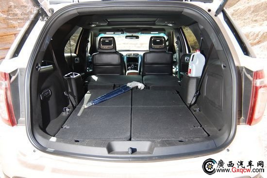 比較顯檔次的配置是第三排座椅電動折疊、展開按鍵。將后兩排座椅放倒后,探險(xiǎn)者可以提供十分平坦的裝載面。如果對如此碩大的行李空間還不滿意,不妨裝上拖車。根據(jù)廠商的數(shù)據(jù),探險(xiǎn)者的最大拖拽能力可達(dá)2268 公斤。而且,探險(xiǎn)者采用了與F150 相同的拖車穩(wěn)定控制系統(tǒng),并配有可變焦的后視攝像頭,足以應(yīng)對正常的拖車任務(wù)。