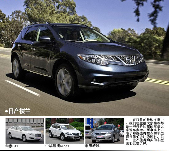 點評:雖然說樓蘭的外觀設計頗具個性,內(nèi)飾和動力水平表現(xiàn)也尚可,可它卻沒有得到消費者的認可。其實,偏高的定價是它的致命傷,再加上個性夸張的外觀,造就了它不被人認可的悲劇。即便是在這個SUV非;馃岬哪甏,像樓蘭這樣沒有一定的競爭力同樣不會有好的反響。