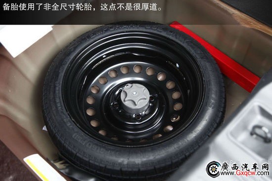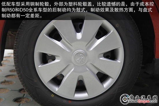 采用了瑪吉斯輪胎,規(guī)格為185/65 R15。輪胎特點(diǎn)為注重行駛舒適性及靜音性,備胎使用了非全尺寸輪胎。并且比較遺憾的是,由于成本控制R50和D50全系車(chē)型的后制動(dòng)均為鼓式,制動(dòng)效果及散熱方面,與盤(pán)式制動(dòng)都有一定差距。