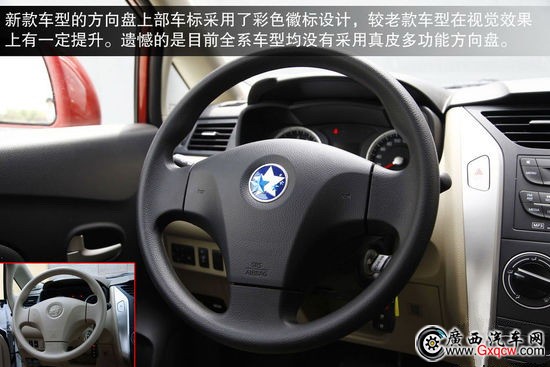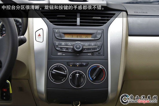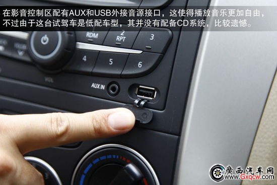 新款車(chē)型的方向盤(pán)車(chē)標(biāo)采用了彩色徽標(biāo)設(shè)計(jì),較老款車(chē)型在視覺(jué)效果上有一定提升。遺憾的是目前全系車(chē)型均沒(méi)有采用真皮多功能方向盤(pán)便利性有待提升。中控臺(tái)分區(qū)很清晰,旋鈕和按鍵的手感都很不錯(cuò)。在影音控制區(qū)配有AUX和USB外接音源接口,這使得播放音樂(lè)更加自由,不過(guò)由于這臺(tái)試駕車(chē)是低配車(chē)型,其并沒(méi)有配備CD系統(tǒng),比較遺憾。