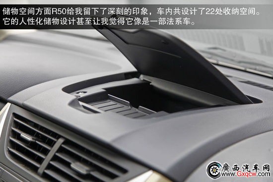 值得肯定的是在車(chē)內(nèi)的儲(chǔ)物空間方面,R50給我留下了深刻的印象,儲(chǔ)物盒或儲(chǔ)物槽非常豐富,這甚至讓我覺(jué)得它是一部法系車(chē),人性化儲(chǔ)物空間非常充裕。車(chē)內(nèi)共設(shè)計(jì)了22處收納空間滿足隨時(shí)隨地的儲(chǔ)物需求。