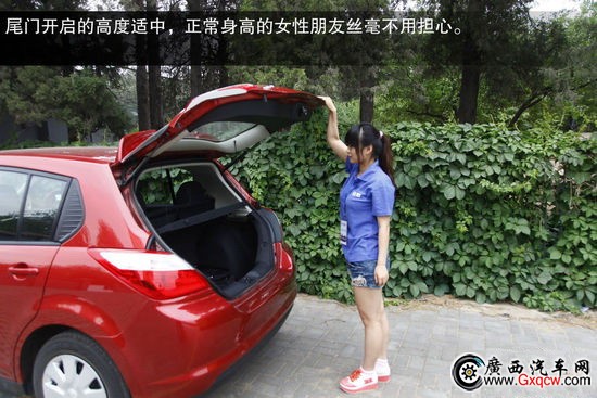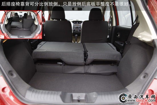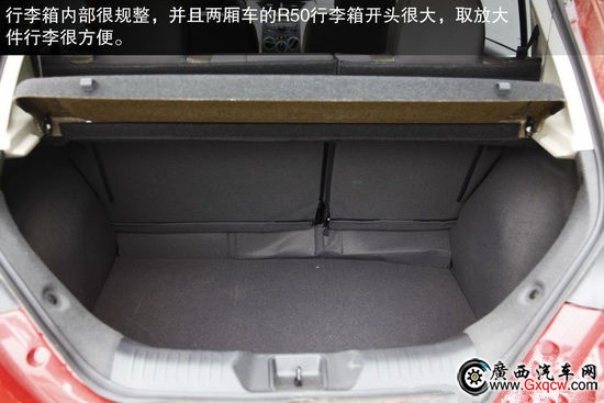 行李箱內(nèi)部很規(guī)整,并且兩廂車(chē)的R50行李箱開(kāi)頭很大,取放大件行李很方便。尾門(mén)開(kāi)啟的高度適中,正常身高的女性朋友絲毫不用擔(dān)心。后排座椅靠背可分比例放倒,只是放倒后底板平整度不是很好。