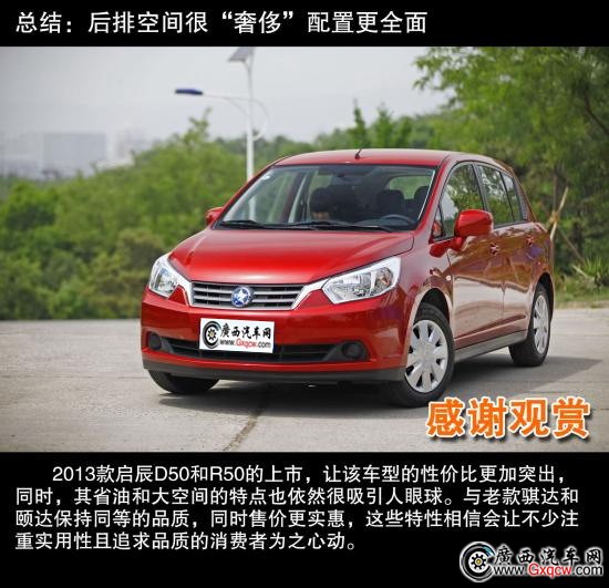 2013款啟辰D50和R50在外形、車(chē)身顏色、配置以及變速箱方面都有著一定程度的升級(jí)或改進(jìn)。可以說(shuō)新款車(chē)型在性價(jià)比方面,以及燃油經(jīng)濟(jì)性方面都有所提升。