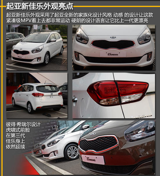 起亞新第三代佳樂由起亞首席設計師彼得-希瑞爾(Peter Schreyer)設計,采用了起亞最新家族式設計風格,虎嘯式前臉依舊在車頭上得到延續(xù)。新車下保險杠與霧燈相連,造型較為圓潤,而整車的腰線十分流暢,為整車外觀營造出動感的一面。