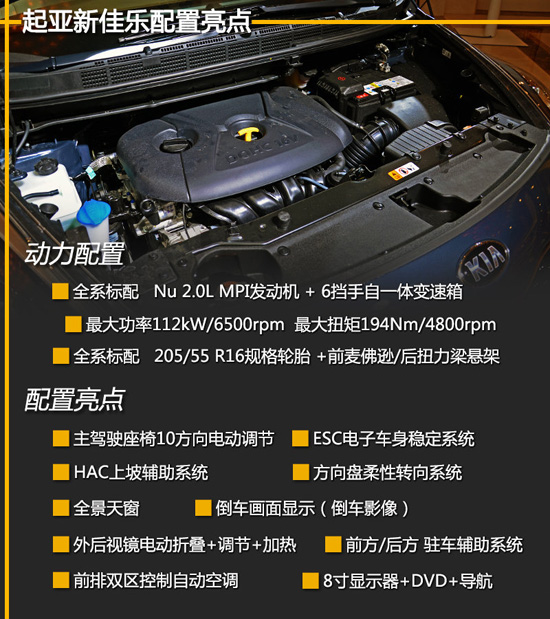 配置方面,第三代佳樂采用了Nu 2.0L MPI自然進氣發(fā)動機,并搭配6擋手自一體變速箱。并且標配全景天窗、一鍵啟動、方向盤加熱、雙區(qū)自動空調、電動調節(jié)座椅及座椅加熱等。安全性方面則配備了車身穩(wěn)定控制、電動助力轉向、6安全氣囊、HAC上坡輔助、前后方駐車輔助、ECM防炫目內后視鏡、Active ECO系統(tǒng)等。