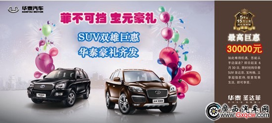 為了讓更多消費者都有機會享受華泰SUV購車節(jié)“SUV雙雄巨惠 華泰豪禮齊發(fā)”的實惠,南寧市信義德汽車銷售有限公司將舉辦“菲不可擋 寶元豪禮”周末店頭活動,進店均有禮品贈送,活動當天訂購車均有鉅惠加禮品贈送。